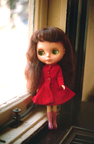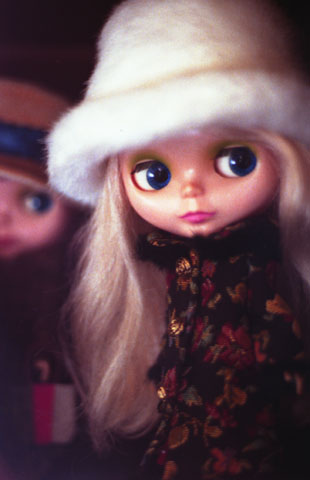 011 >> Winter 2002 スキッパーのアウトフィットに ファーハットの組み合わせ。この帽子、前出のイーメちゃんにそっくりでかなり気に入ってます。ブライスの頭ってちょうど猫くらいのサイズだから、なでると本物の猫みたい。ちなみにバッグは私の冬用のバッグに似せて、パーキーが革で作ってくれたもの。 [ Outfits ] hat/*phase |