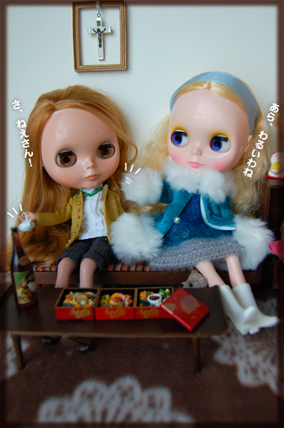 560 >> January 2008 サフィー:「それじゃあ全員そろったところで。。。さあさ、ねえさん一杯!」 ハロー:「あら〜、それじゃお先に」 豪華なおせちを並べて、新年会のスタートです! |