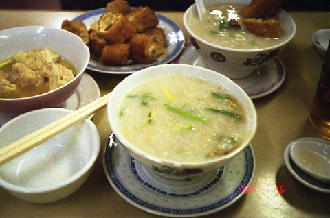 130 >> January 2004 @香港 これはホテルのすぐそばにあった有名なお粥屋さん「彌敦麺粥家」にて。 手前のがアワビ粥、奥のが貝のお粥。 どちらも深みのある味で、今回食べたお粥の中ではベストワン! また食べに行きたい。。。と真剣に思わせてくれる逸品です(笑)。 お粥ってお腹いっぱいにならないイメージがありますが、 こちらのお粥は密度が高く、お米のポタージュという感じで、 揚げパン(というのかクルトン)のようなものを一緒に食べると、 ちょうどお腹いっぱいになります。 |