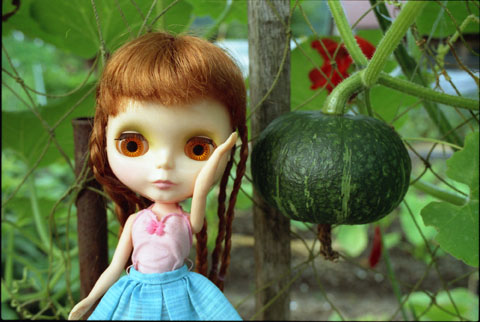 190 >> July 2004 @ 板取村 宿の近くのお家に生っていた小さなかぼちゃ。 アンナちゃんのお顔と同じくらいです。 |