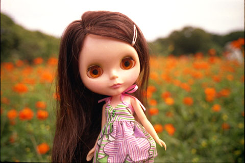 207 >> September 2004 @ 浜離宮庭園 きれいなオレンジの花畑にて。背景いっぱいに続く花畑って、ありそうでない景色。ブライスの瞳とぴったり合いました(^^)。 |
