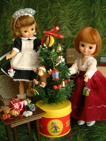 221>> December 2004 クリスマスツリーにぴったりのオーナメントを義母からいただいたので 早速、ベッツィたちにツリーの飾り付けをお願いしました^^。