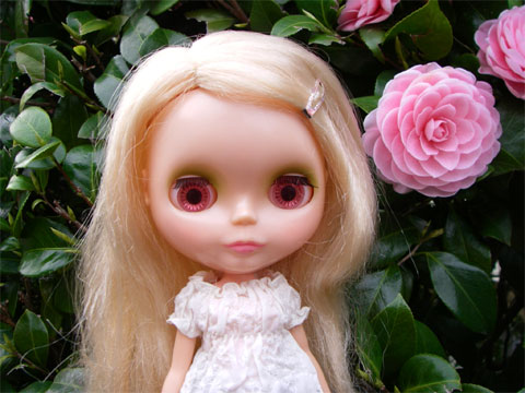 339 >> March 2006 こちらは完璧なかたちの乙女椿。 ブライスのピンクの瞳にそっくり! |