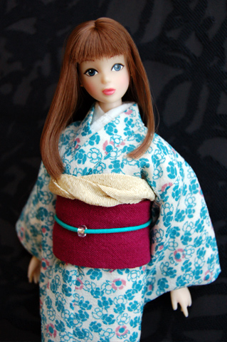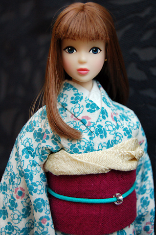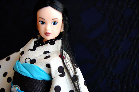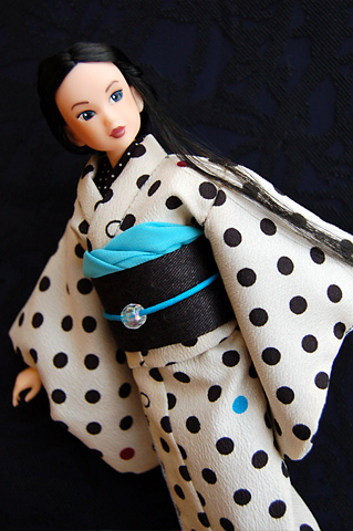 375 >> August 2006 帯留のビーズと差色のブルーが涼しげ。 水玉づくしって可愛くて永遠に好きなテーマだな。 |