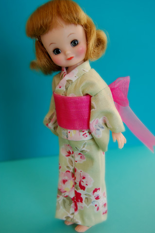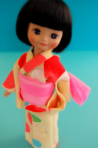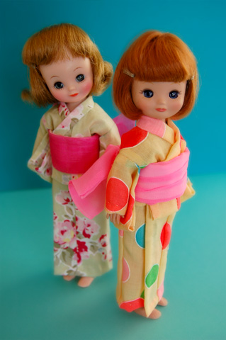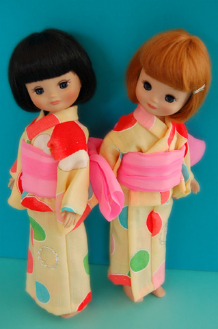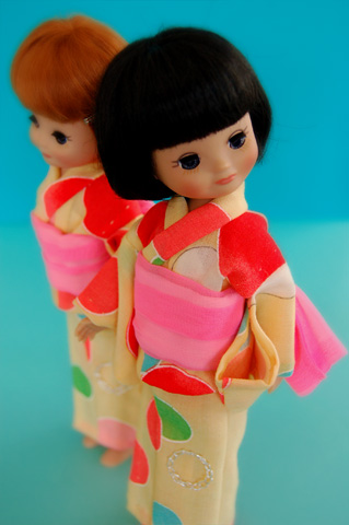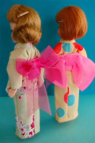 469 >>April 2007 みずたま浴衣の方は金魚帯をイメージして、だらりと垂れたリボンの形に結びました。 この形がなかなか決まらなくて、いちばん苦労したかも。 色や形など、頭の中にはっきりしたイメージがあると、作る時に逆に大変だったりしますね。 花柄の浴衣の方は色が気にいって、何かにラッピングしてあったリボンをオビに代用してます。